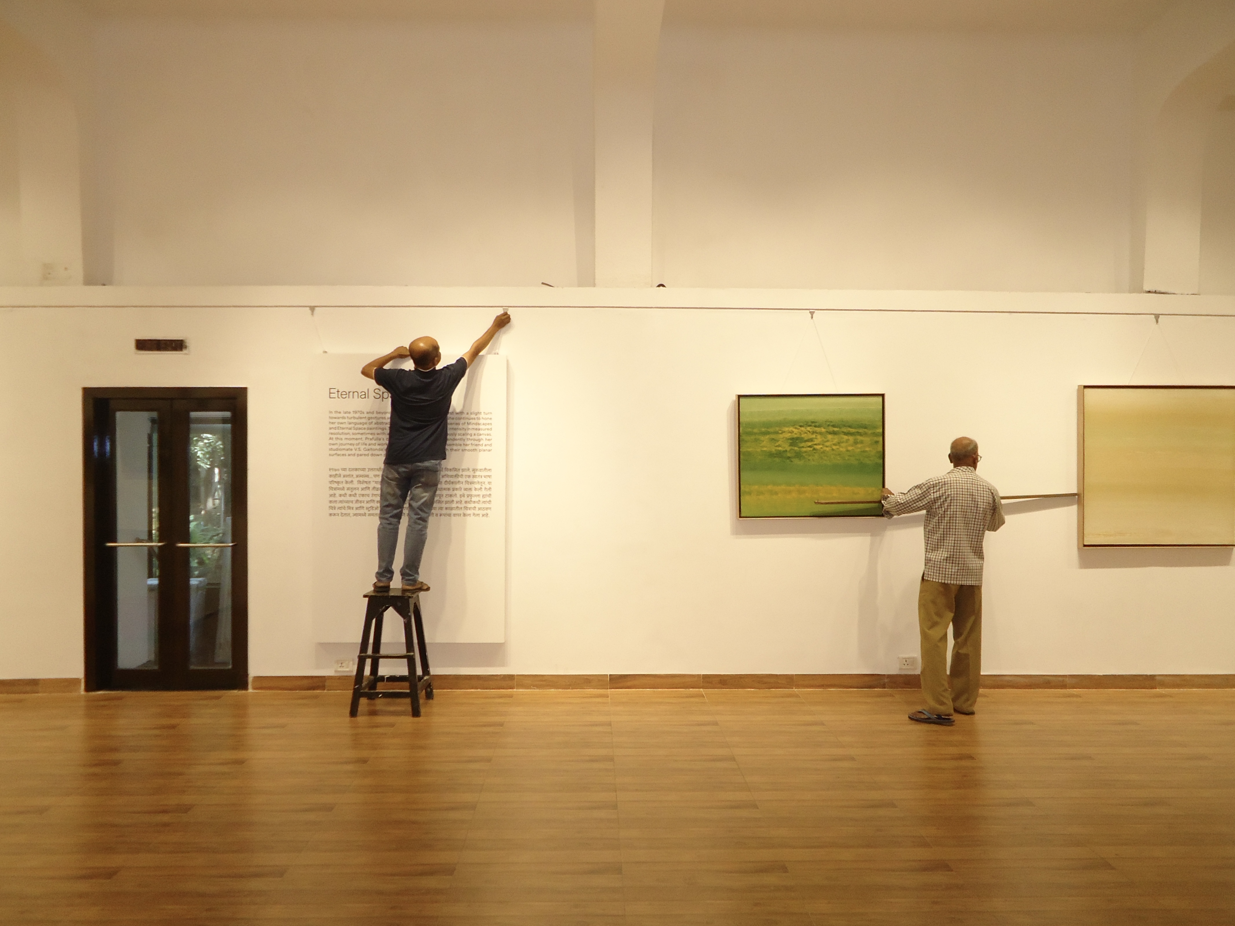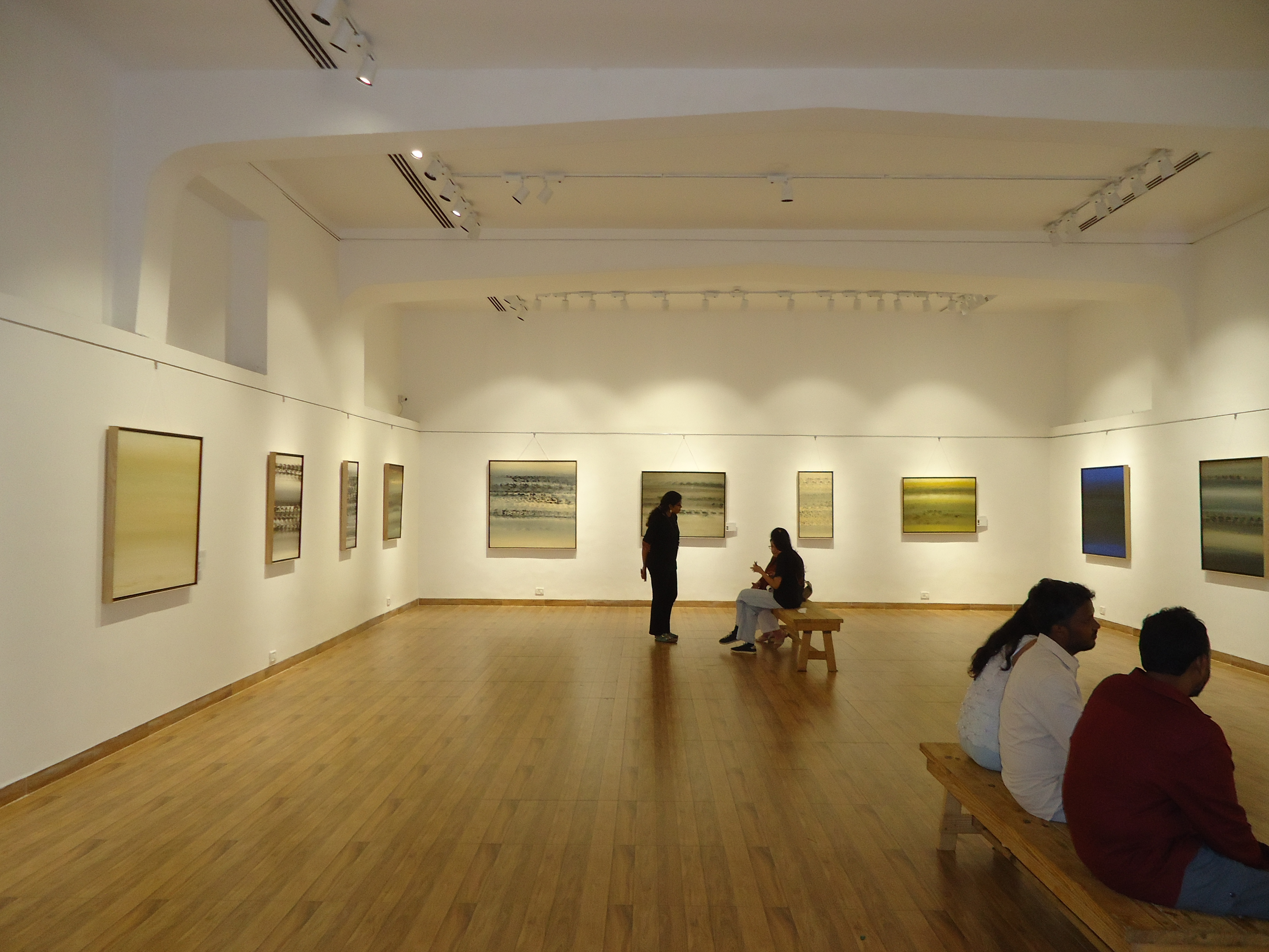 I worked closely with the curator to plan the layout and narrative flow. Moving through the gallery, one follows Prafulla’s growth chronologically. Starting with her figurative sketches and material explorations, and moving towards ‘eternal space,’ her final collection of abstract works.